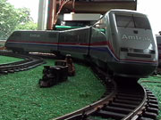 NBC 4 WKYZ has a new studio building on Amecker St., across the tracks from SERR School. It is used for Good Morning Legoland and news programs, including PRR Update, the railroad's own news program. Inside, you'll find a desk, cameras, and TVs. The footage from the cameras is sent wirelessly to WKYZ's main building for editing and transmission. The studio is made from a tree box, and uses a wooden box, LGB model scale people, and computer print-outs. We cut the bottom of the box off, covered it with paper, and filled the inside. We have not put any lights in the building, however some light is provided by the Christmas lights that we have strung around most of our buildings that give needed ambient outdoor light.