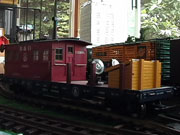The second class combine gives passenger and cargo space. Half of the space is for people, which is just like the second class coach, and the other half is for cargo. The combine gives comfort at a good price, since the interior is not as fancy as the first class combine. The usual train is the E&A Express Deluxe, which is pulled by the Pennsylvania Engine and the Stainz Engine. We installed the lighting in all of the coaches, which adds a level of realism when running the trains at night. We have started to fill all of the coaches with people, however we don't have that many right now. The doors are spring loaded, so you can open them and they will close themselves. The interior is very detailed, and even includes a bathroom and a stove. The only problem we have with the coach is that the railings are slightly flimsy, but that's small compared to the benefit of the combine.