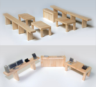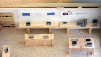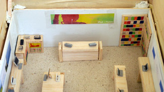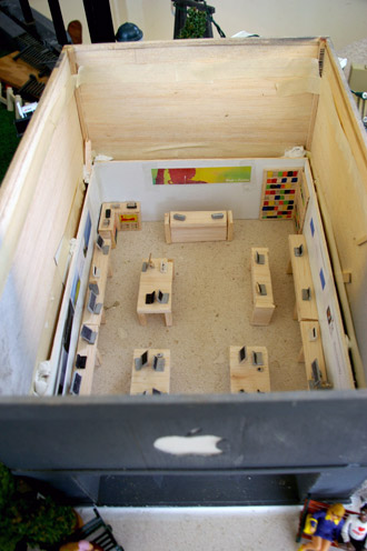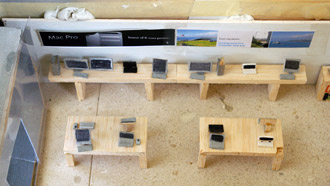 Almost the entire interior was made from balsa wood. The walls were thin sheets of balsa painted white. The tables were made from thicker sheets and from sticks. Here, the balsa was left in its natural color. After cutting the pieces to size, they were fastened with wood glue. The computers and peripherals were cut from thin balsa sheets and painted white, black, or gray to match the real device represented. In particular, the iMacs and displays were tricky because these both have L-shaped stands from which the devices hang. When they were dry, the computers and peripherals were glued to the tables. The computers' screens were drawn with black ink. The cabinet contents were drawn with ink and marker. The signage lining the walls of the store was created on our computer, printed out, and taped on. The ceiling was made from a sheet of card stock, illustrated with pencil, and strengthened with balsa sticks. Holes were cut in the ceiling for the lights.