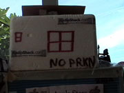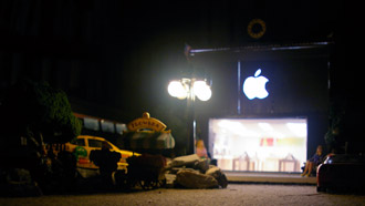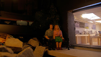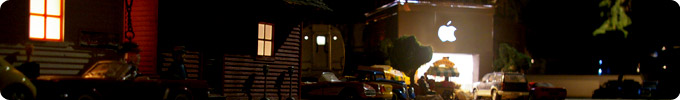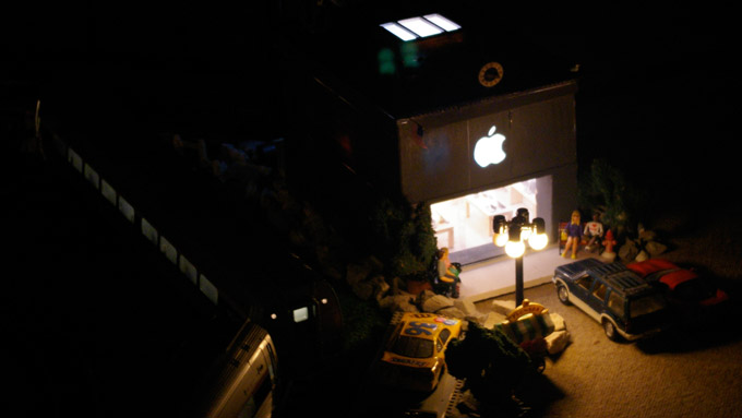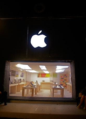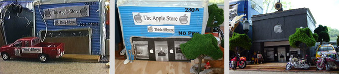 Since early 2002, our layout has had an Apple Store. Originally a crude cardboard building with a garish blue color, the store was completely redone in May, 2004. The new structure was made from painted balsa wood with a cardboard roof and had a lit Apple logo on the front. The one holdover from the original building was the depiction of the store's interior: a black-and-white print out of a picture taken from the front of a real store. In August and December, 2008, a third upgrade of the store brought a rehabilitated structure and a complete interior.
