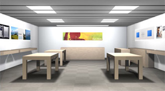 Looking from the front of the store to the back, the first row and the left half of the second row have tables of computers and peripherals such as iPods and iPhones. The banners on the walls advertise the Mac Pro, the iPod family, and the use of family photos. The right half of the second row is the store's Genius Bar where customers receive technical support. The wall table is the same as the other three in the store, but in place of a full floor table there is a taller, shallower counter. The wall banner has the Genius Bar logo and representations of LCD screens. The third row has, from left to right, a cabinet for larger peripherals such as printers, a check-out counter with an iPod ad banner above it, and software shelves.