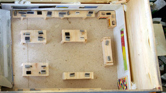 The first phase of the renovation involved securing and stabilizing the store's structure. Previously, the store had sat directly on a surface and, after four years, the glue had lost some strength and the walls were no longer square. We salvaged two stone tiles and used them as a base. After aligning the walls we attached the building to the base with caulk. We also used caulk to secure the walls to each other and as a general adhesive for certain parts of the project. The result was an immensely more stable building. We also replaced the ragged cardboard roof with one made of asphalt shingles. We cut a hole in the new roof to allow light from within the store to exit through the skylight.