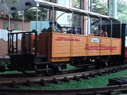 0:12 An LGB Norfolk and Western Hopper Car pulled by our LGB Track Cleaner and a log train pulled by our LGB Furka-Oberalp Switcher pass by, the latter under a rather rediculously placed tunnel. Watch